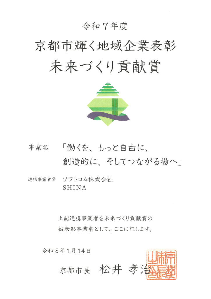 この度、ソフトコム株式会社とSHINA様とのコワーキングスペースsaladbowlでの連携事業である、「働くを、もっと自由に、創造的に、そしてつながる場へ」が、令和7年度 京都市輝く地域企業表彰「未来づくり貢献賞」を受賞いたしました。
